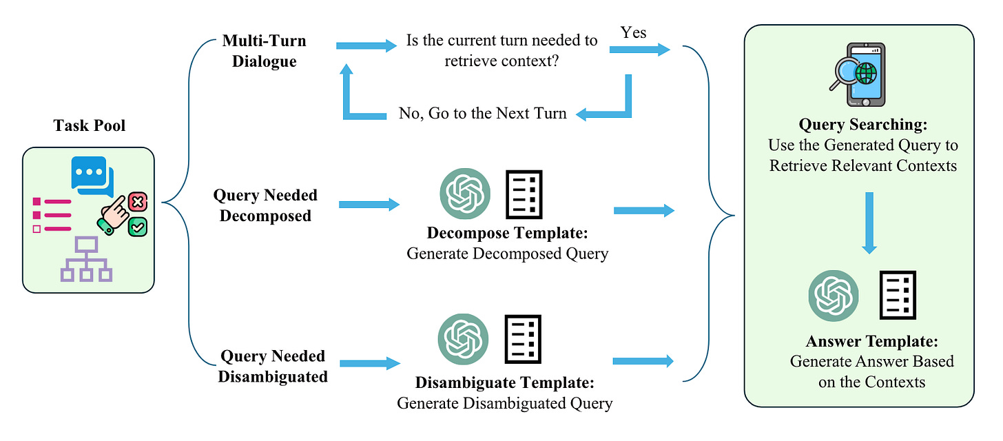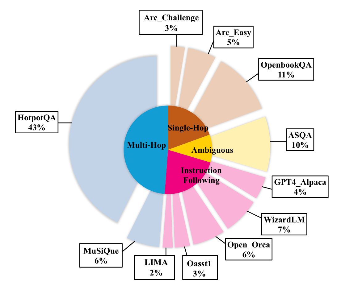 Figure 3: The composition of the dataset. Source: RQ-RAG. The tasks in the task pool are divided into three categories: multi-turn dialogue, decomposition, and disambiguation. For instance, samples in a multi-turn dialogue dataset are classified under the multi-turn dialogue category.