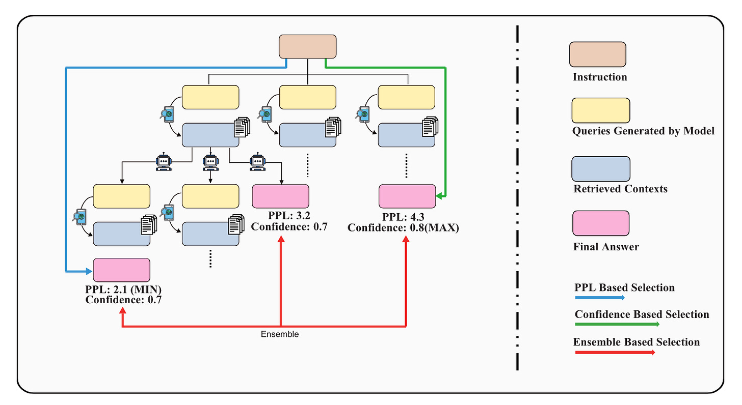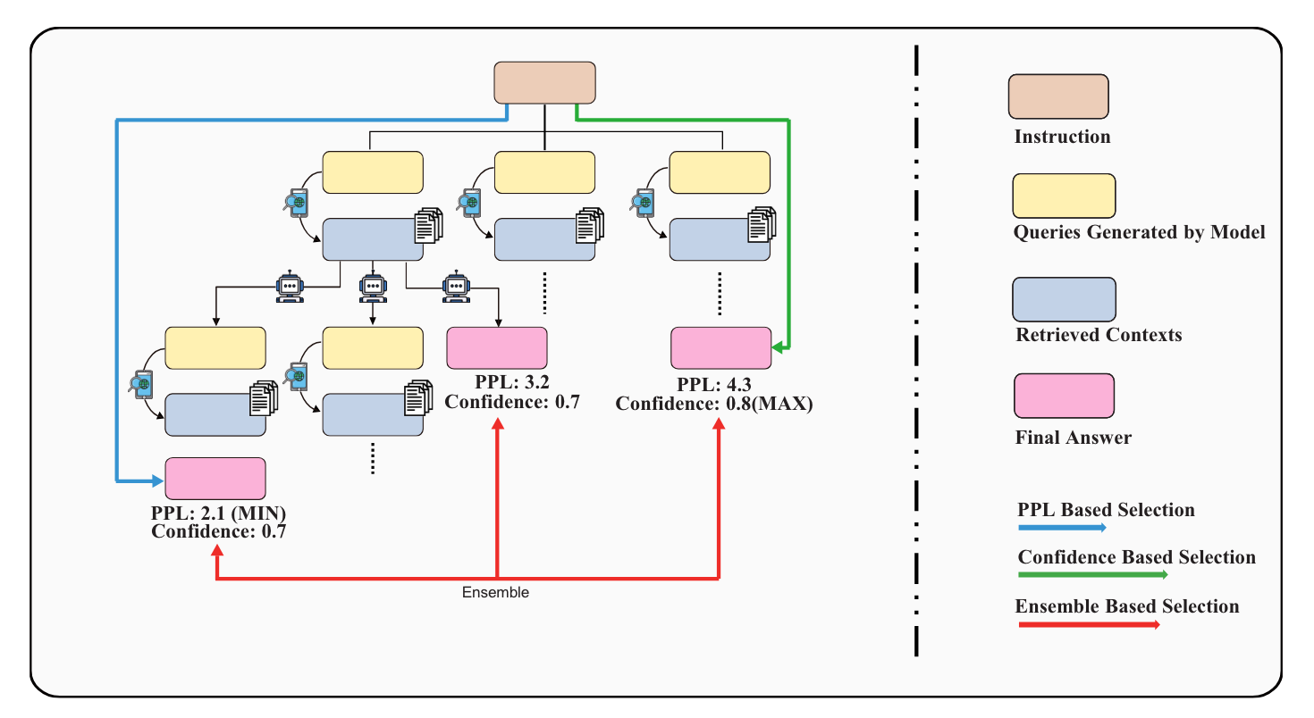 As illustrated in Figure 8, RQ-RAG has developed a tree decoding strategy and uses three selection methods: PPL Based Selection, Confidence Based Selection, and Ensemble Based Selection.