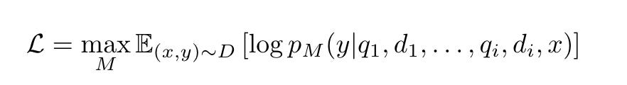 In simple terms, the objective of training is to adjust the model parameters so that at the i-th step, given the original input x, the enhanced query qi, and the retrieved document di, the model M should generate the highest probability for the response y.