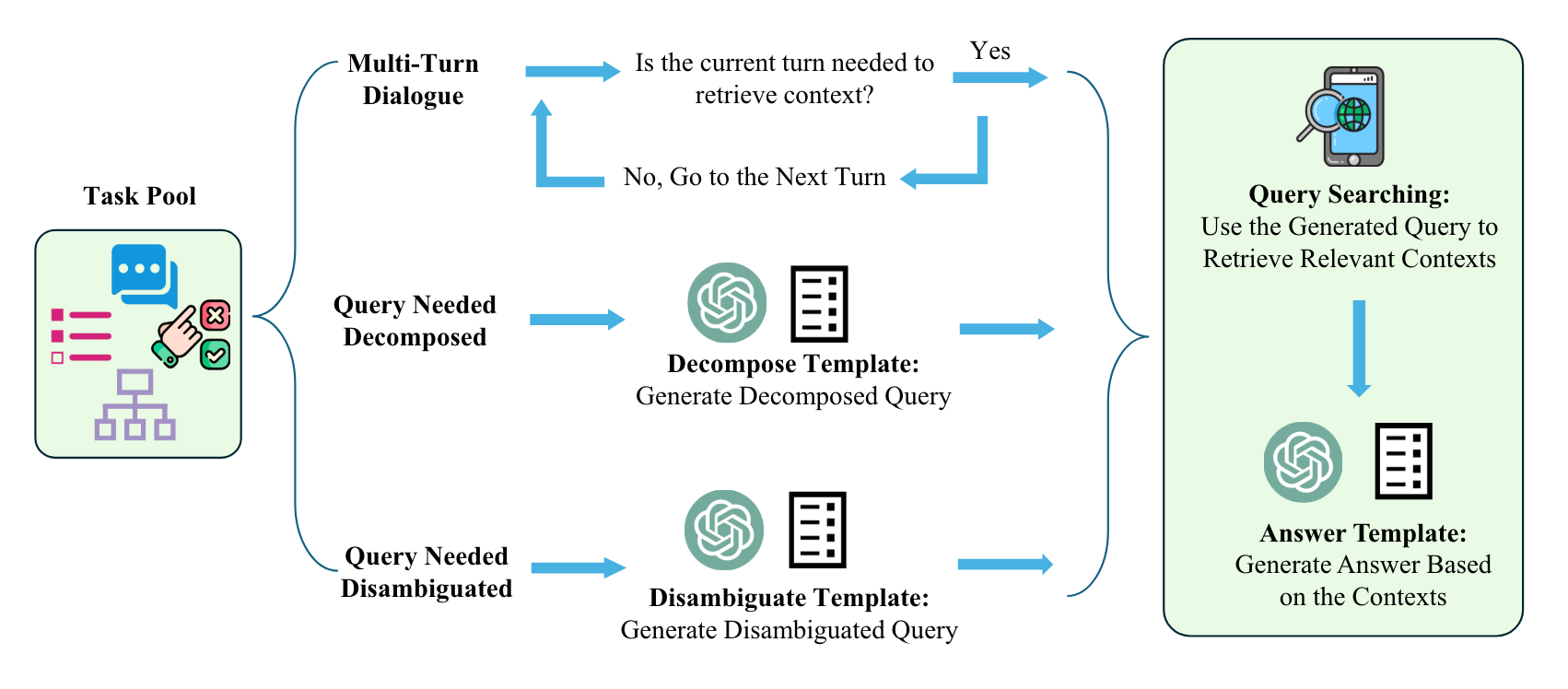 Collect a corpus, as illustrated in Figure 3, that includes various scenarios including multi-turn dialogues, queries that require decomposition, and queries that need disambiguation. Use this corpus to create a task pool.