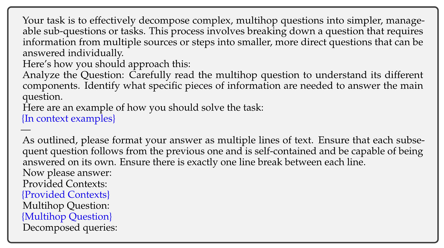 For complex queries, they are divided into simpler, answerable subqueries. The corresponding information is then retrieved for each subquery, thereby forming a comprehensive response to the original complex query, as depicted in the top right of Figure 1.