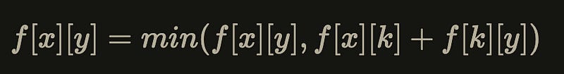 f[x][y] = min(f[x][y], f[x][k] + f[k][y]);Typical example problems