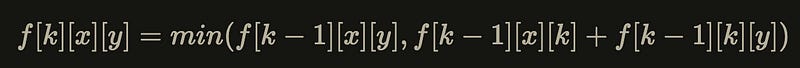 f[k][x][y] = min(f[k - 1][x][y], f[k - 1][x][k] + f[k - 1][k][y]);We notice that the meaning of f[k][x][y] is the minimum value of all elements in the x-th row and y-th column on the plane where the first dimension is k-1. If we compress this three-dimensional matrix into a two-dimensional one, then the result f[x][y] that we want to find initially equals to the value of the original f[k-1][x][y]. It will still become the minimum value of that row and that column at the end, so changing it in place will not affect the value of the minimum.