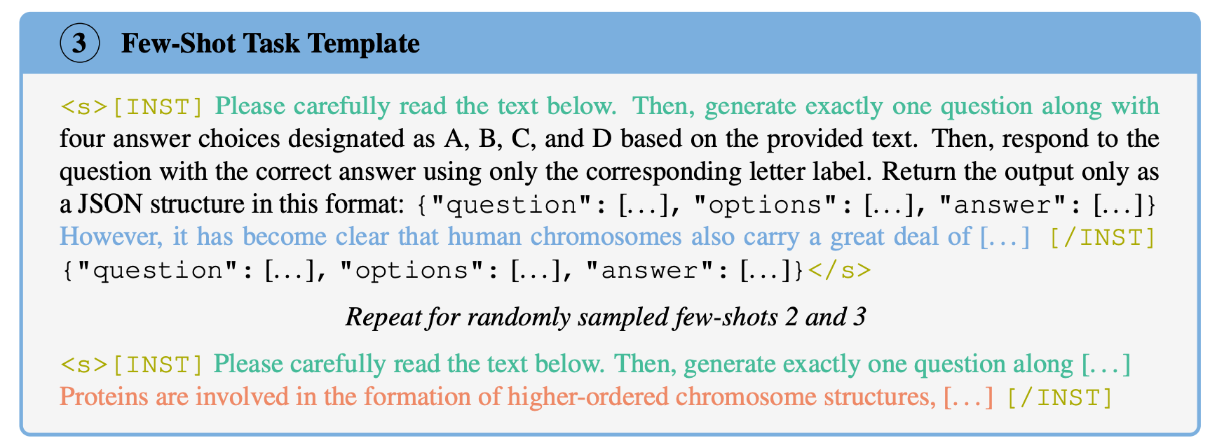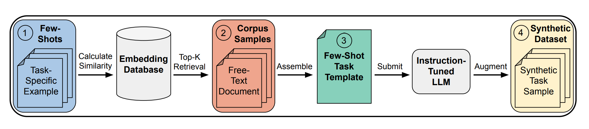 The few-shot examples serve as templates, guiding the transformation of the retrieved documents. The templates specify how the text should be structured for the task. For example, a retrieved scientific article could be augmented into a question-answer format for a QA task. Figure 4 shows an example of how these templates guide the model in augmenting the corpus samples into synthetic task samples.