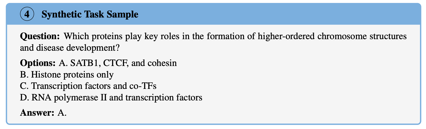 The final output of CRAFT is a large-scale synthetic dataset that mimics the format of the few-shot examples but is generated from real human-written documents. This dataset is then used to fine-tune language models on the specific task, such as biology QA, medicine QA, or summarization. Figure 5 shows an actual example output from the generated pool of synthetic training samples