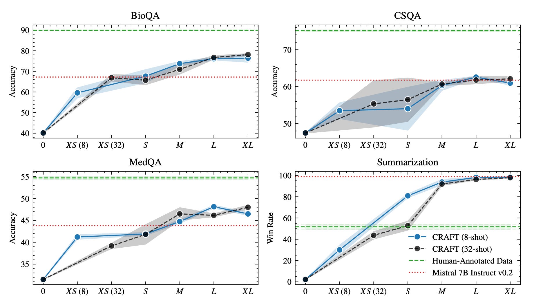 Extensive evaluations were conducted using CRAFT-generated datasets for four tasks: biology QA, medicine QA, commonsense QA, and summarization. The experimental results indicate that models fine-tuned with CRAFT-generated datasets either outperformed or matched the performance of instruction-tuned LLMs across all tasks.
