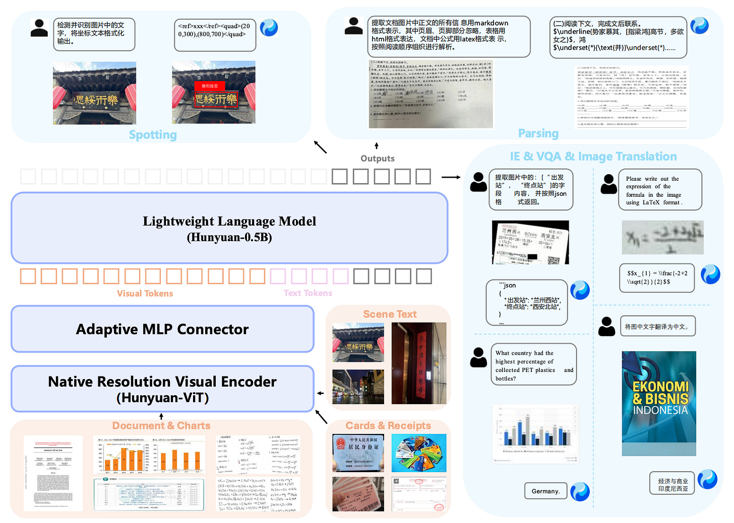 Native Resolution Visual Encoder (Hunyuan-ViT): Built on top of the SigLIP-v2-400M pretrained model, this module preserves the original aspect ratio of images using an adaptive patching mechanism. It natively supports arbitrary input resolutions, making it particularly suitable for extreme aspect ratios such as long-text documents and other non-standard layouts (e.g., receipts).