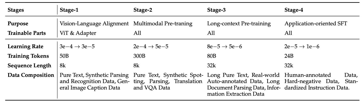 Stage 3 (Long-Context Support): the context window is extended to 32k tokens by incorporating long-document parsing and lengthy text data, enhancing the model’s ability to handle long contexts.