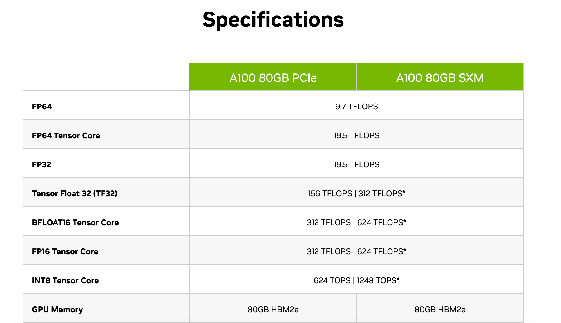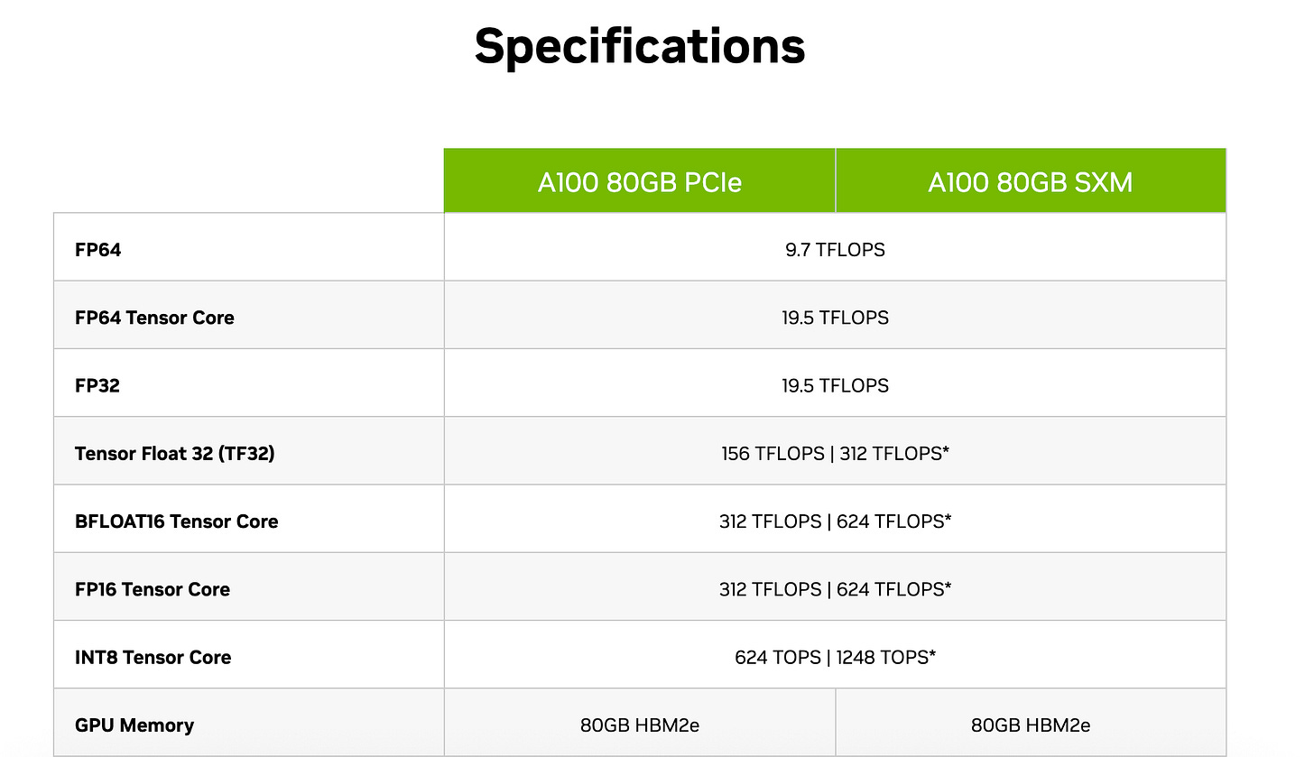Take the NVIDIA A100 80GB, for example. Its theoretical peak performance in FP16/Tensor Core mode is 312 × 10⁹ FLOPS, but in practice, you’re likely getting around 50% efficiency — so roughly 150 × 10¹² FLOPS per GPU.